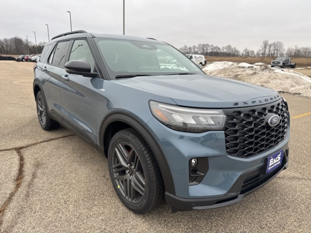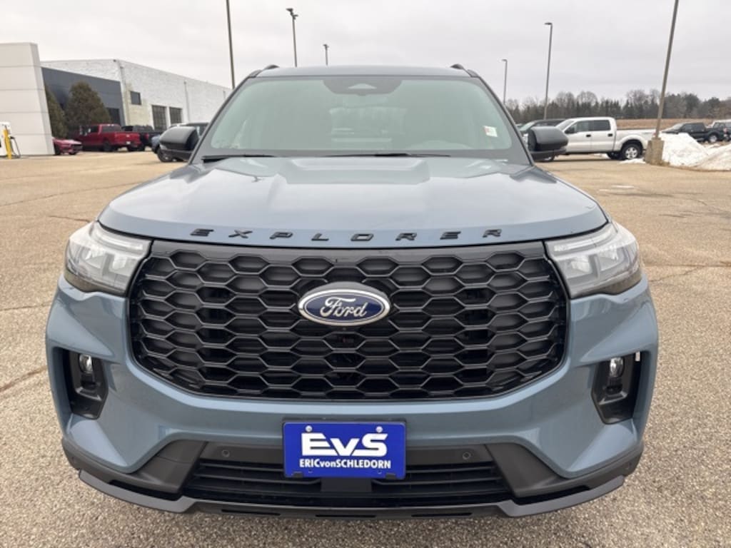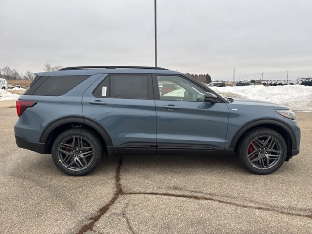 Vapor Blue Metallic 2026 Ford Explorer 4D Sport Utility ST-Line 4WD 10-Speed Automatic 2.3L EcoBoost I-4 110V/150W AC Power Outlet, 2nd Row Captain's Chairs w/E-Z Entry and Armrest, 2nd Row Heated Seats, 3rd row seats: bench, Ambient Lighting, Apple CarPlay/Android Auto, Auto-Dimming Interior Rear-View Mirror, Automatic temperature control, BlueCruise (equipment + 1-Year + 90-Day Plan), BlueCruise Hardware, Equipment Group 300A Standard Package, Exterior Parking Camera Rear, Front and 2nd Rows Floor Liners with Carper Floor Mats, Front Bucket Seats, Front dual zone A/C, Fully automatic headlights, Garage door transmitter, Heated door mirrors, Heated front seats, Heated steering wheel, Heated Unique Cloth Captain's Chairs, Internet access capable: FordPass Connect 5G, Manual-Folding Sideview Mirrors, Memory Driver's Seat, Navigation System, Panoramic Fixed Glass Roof with Power Shade, Performance Brakes, Power door mirrors, Power driver seat, Power Liftgate, Power passenger seat, Premium Package, Radio: B&O Sound System by Bang and Olufsen, Rain-Sensing Wipers (front Only), Rear air conditioning, Rear window defroster, Rear window wiper, Red Painted Performance Front and Rear Brake Calipers, Remote keyless entry, Speed control, Speed-sensing steering, Speed-Sensitive Wipers, Split folding rear seat, ST-Line Street Pack, Wheels: 21" Magnetite-Painted Aluminum.